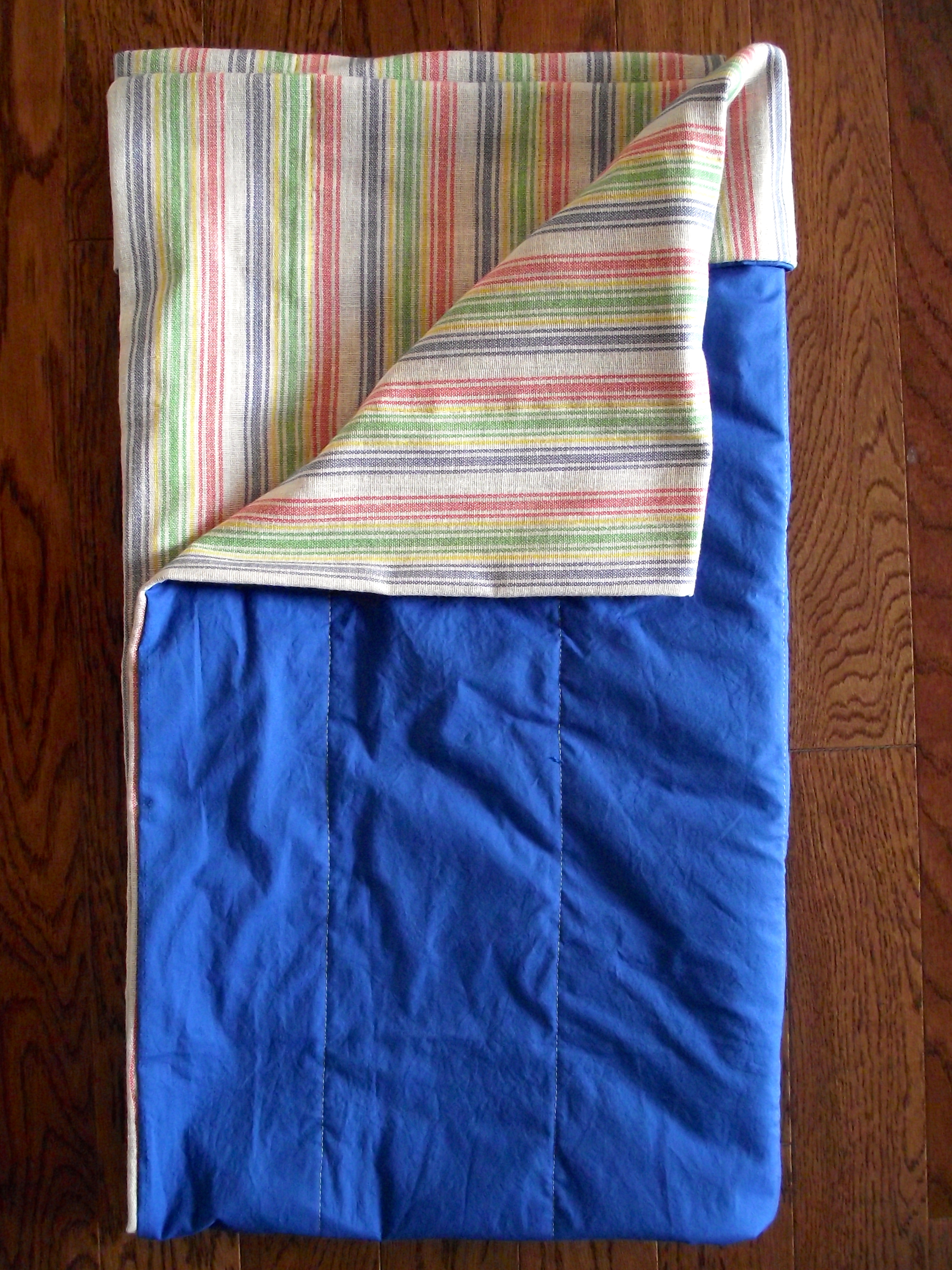 9. Decide how far apart you want your verticle quilting lines. Mark regular intervals. If you love yourself, use these pins to mark said intervals. If you want a kantha-looking blanket, now is the time to hand stitch. If you’d like a more basic and/or faster one, run that thing through the sewing machine. I cheated: I just followed the yellow stripe instead of measuring with my beige thread. You don’t see the quilting from the front. Definitely visible from the back though.