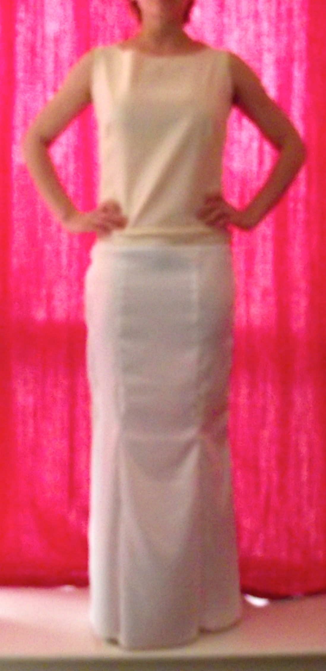 Here it is! I think she’s done — or, I am at least. Four muslins is a lot, even for something I should really care about. I probably was a little over-ambitious on the scale and scope, but in the end this pattern is quite simple: a seven-gore skirt; two waist-band pieces; and a front and back bodice piece.