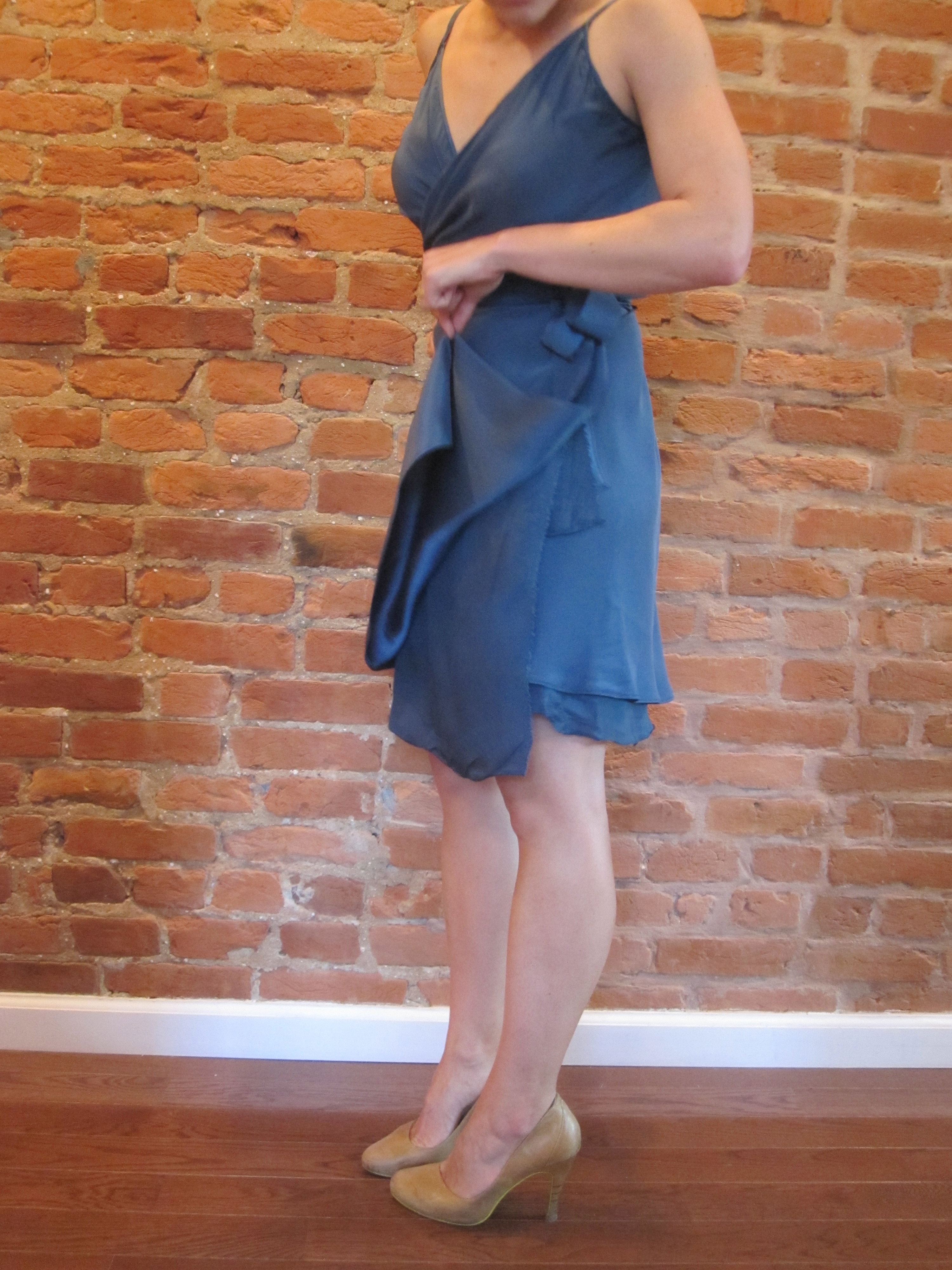 2. Something’s up with the bodice. Even in the very nice versions on the interwebs, the bodice seems a little less DVF and a little more nursing mother — almost too much coverage is going on? Several people complained of gaping at the side boob. The top corners of the wrap looked so high on bloggers who I know are tall, that I dropped them an inch in the front and the back. And I think the peaks of the wrap still look a little high on me. In terms of pattern alterations, I: