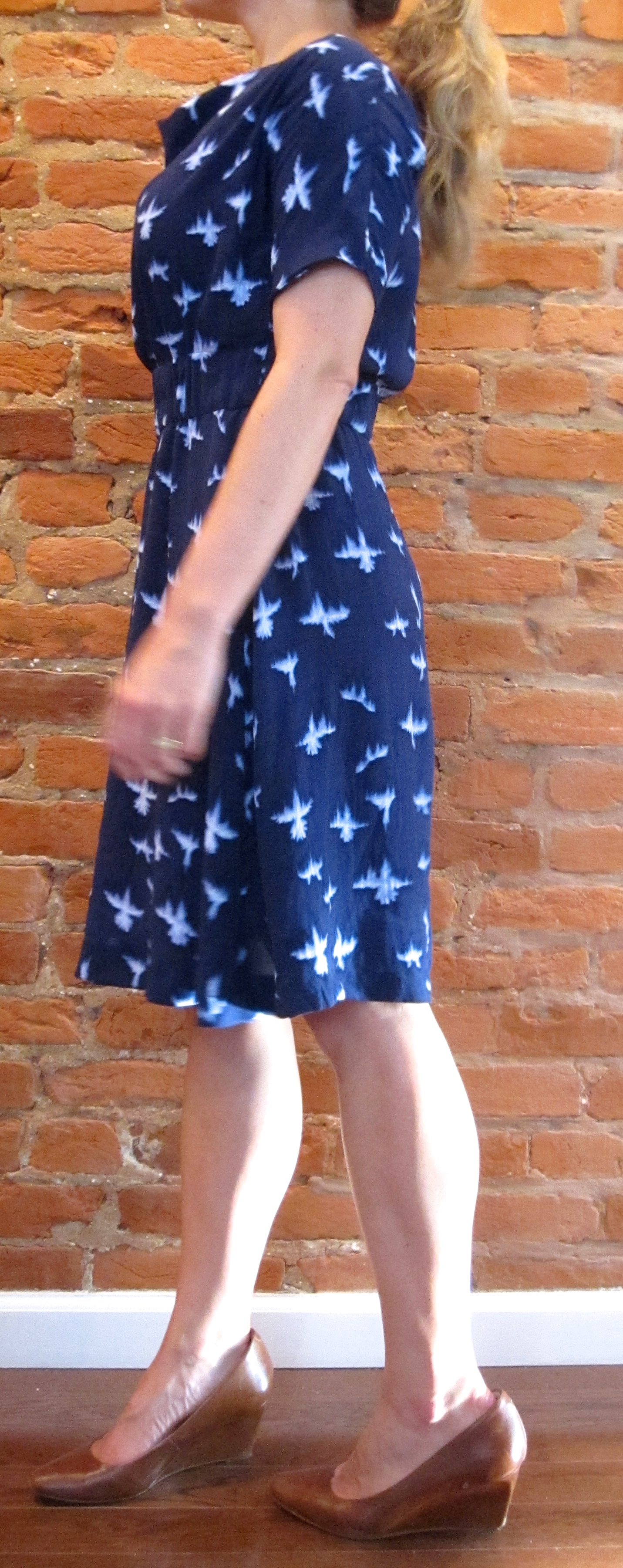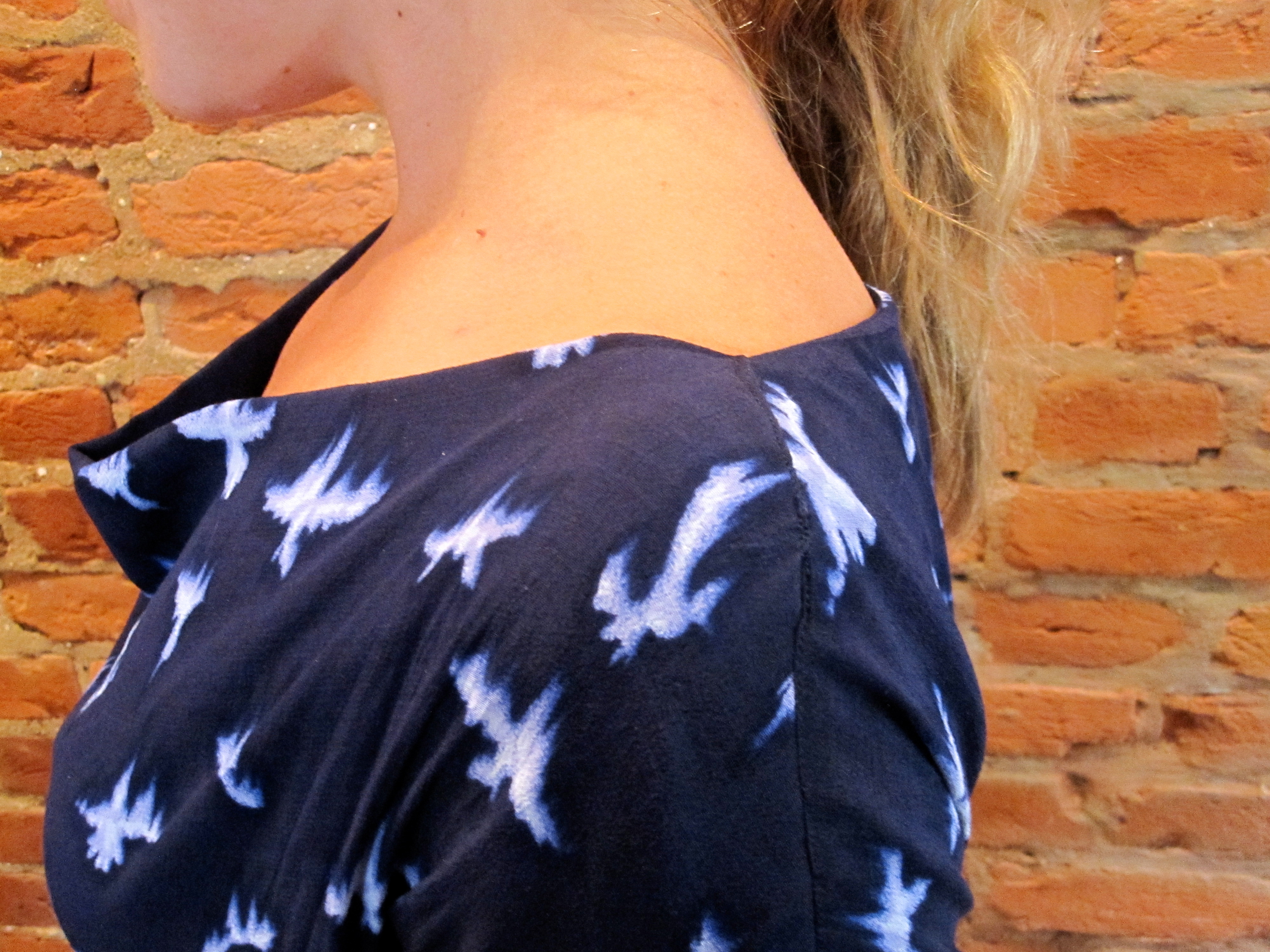I was pretty grump after making my first Colette Myrtle, and I really wasn’t planning on a second one. But this happened anyway, in a rayon woven in a print that looks like shibori dye or maybe birds or possibly many small batmans. I’m much, much happier with this one than the first, but it took a lot of changes to get her there.