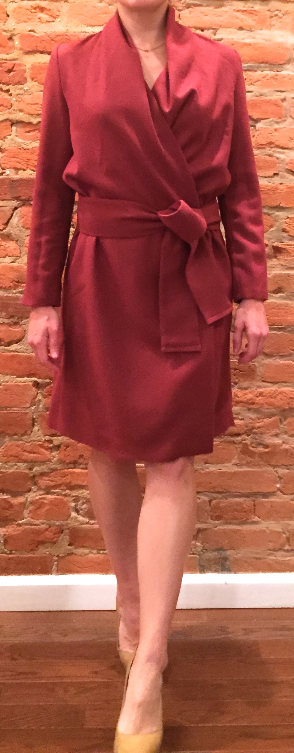 The dress is made of soft red wool crepe and underlined with silk crepe de chine, both from FabricMart.