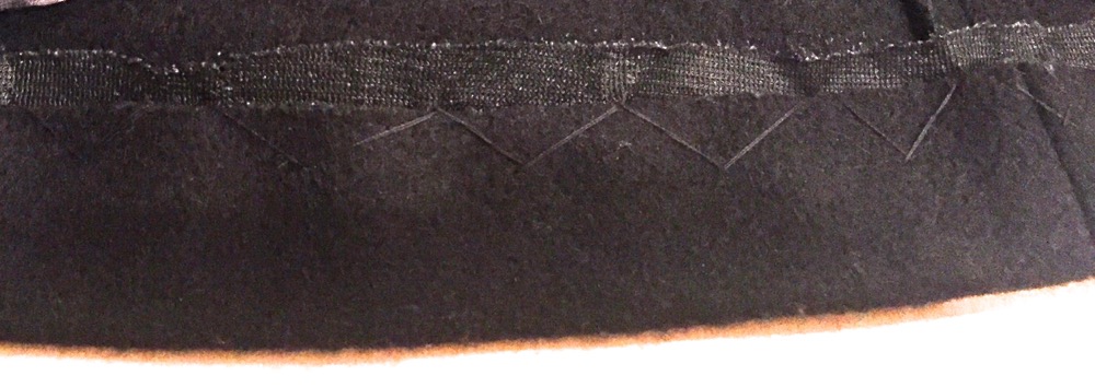 I did, however, use strips of fusible at the hem — about 2 inches for a 1.5 inch hem. This mean I had about .5″ of fusible peaking up over the hem, and I was able to catch stitch the hem but pick up very, very few threads of the coating fabric. Which means I avoided the indentations on the right side of the fabric.
