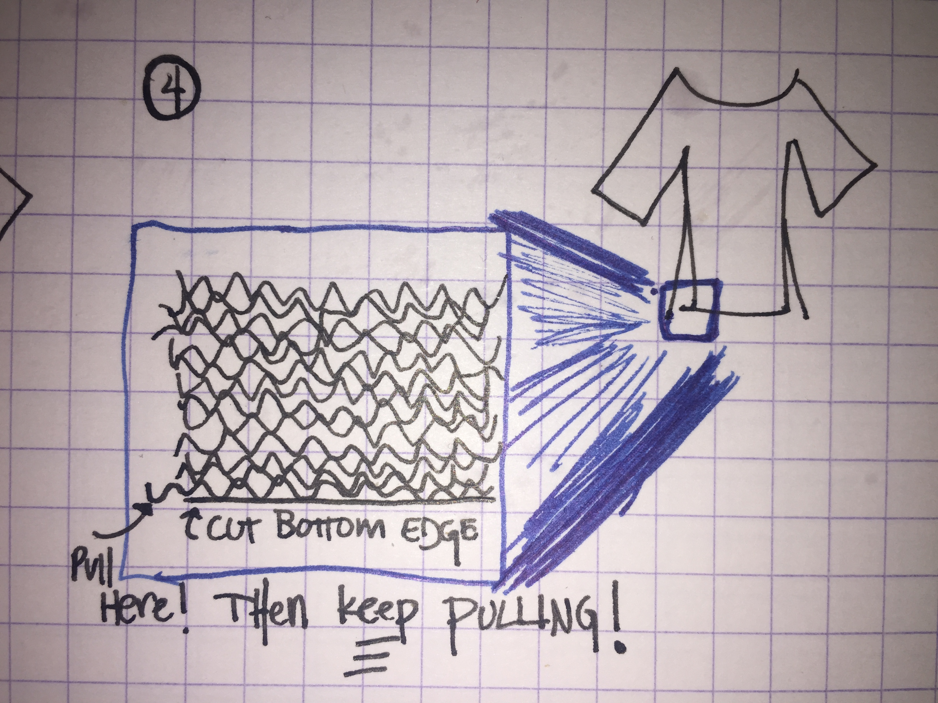 Note: at first you might just get little fragments of yarn fluff. This is because you might have cut through some rows of knit as you were cutting the band off. Have patience. Pull enough stupid tiny threads out and you’ll eventually start pulling the string (ba-dum!) on a longer one.