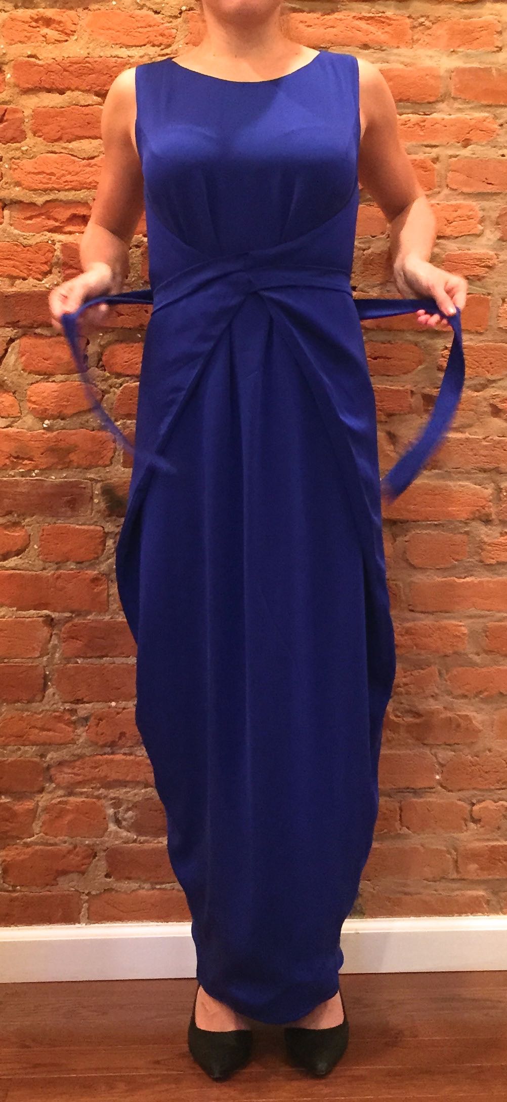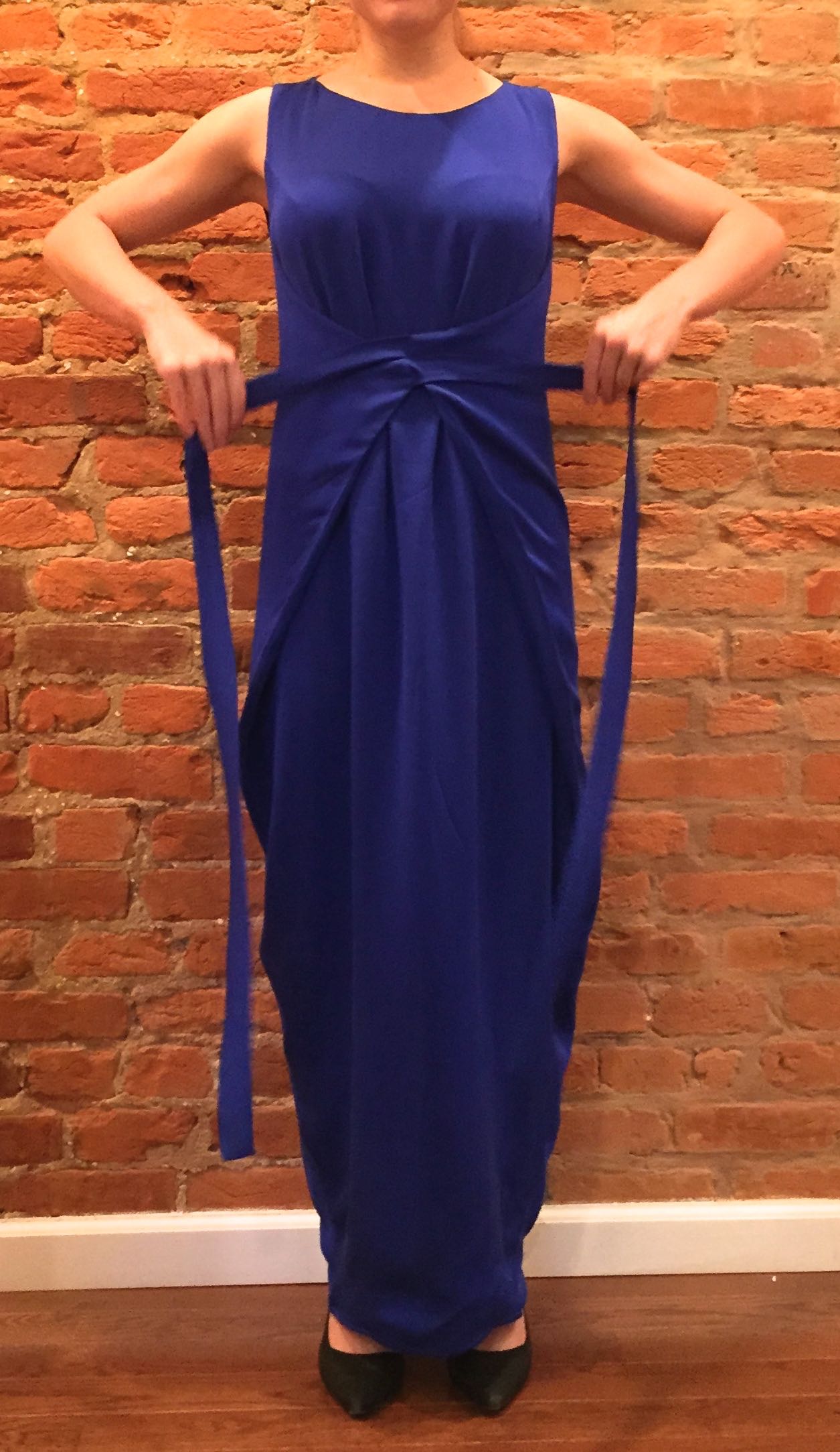 Unwrapped, the dress is essentially shaped like a curvy hexagon, with tails coming out of the side corners. It also mildly resembles one of those squirrel suits that mentalists wear to jump off cliffs. This is not for cliff jumping.