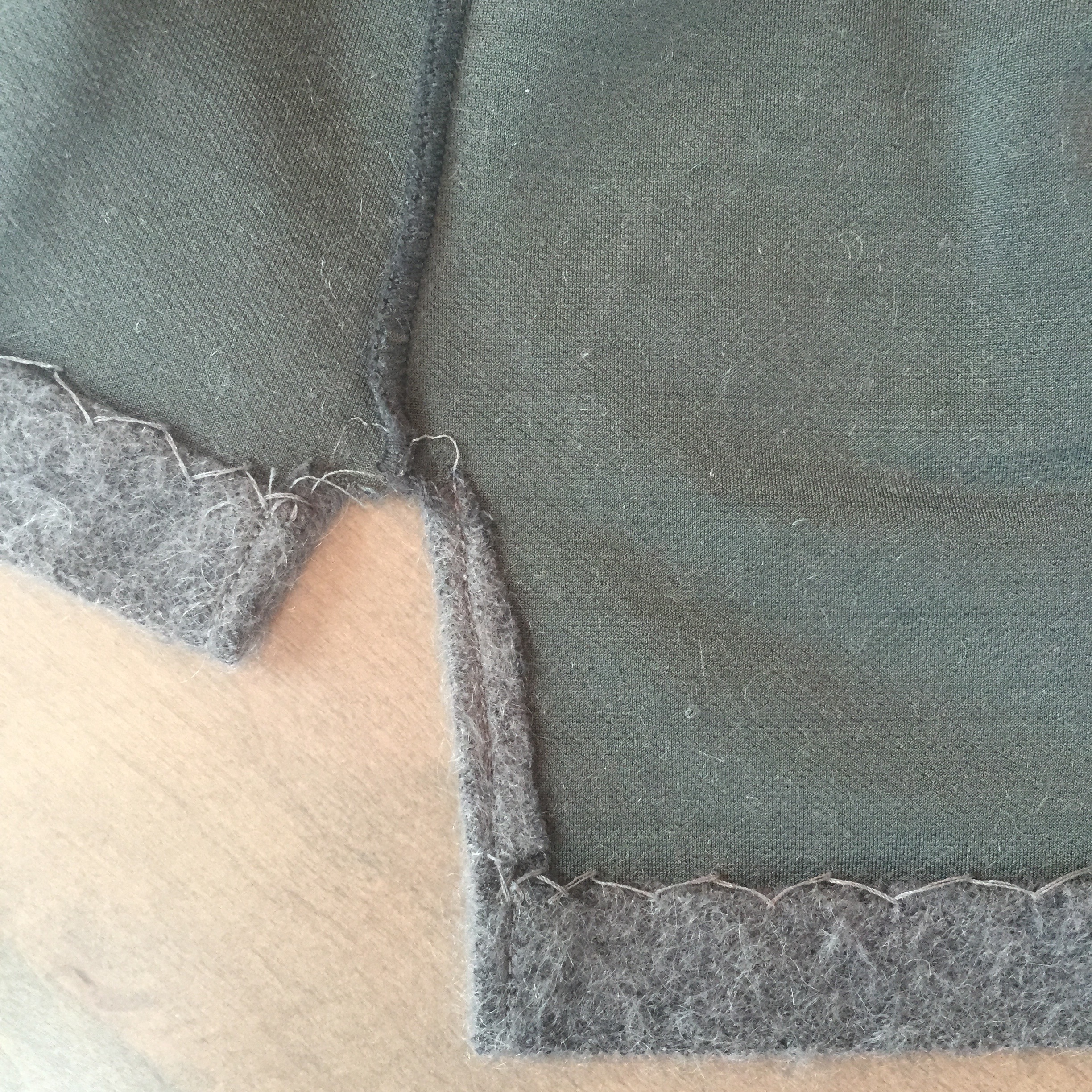 :: I pressed up the one inch hem allowance at the sleeves and hem and then catch stitched the hem to the thick knit backing. The catch stitch has a little give to accommodate the stretch of the fabric, and the knit backing means the catches don’t show through to the right side of the garment.