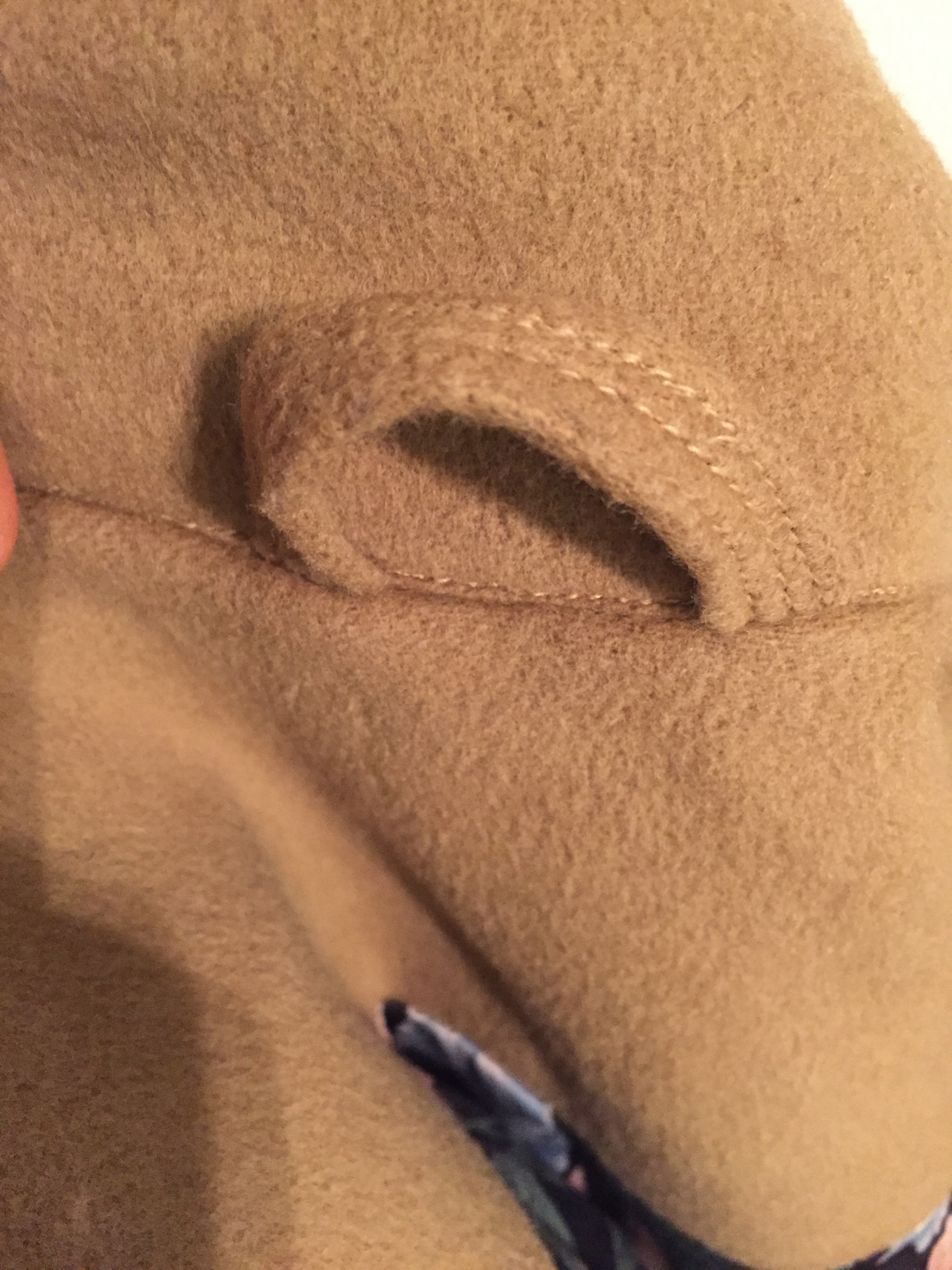 • The belt loop piece was way longer than it needed to be for the two loops. I used the excess to make a hanging loop for the coat, which I sandwiched between the back yoke facing and the collar. stella-coat-14