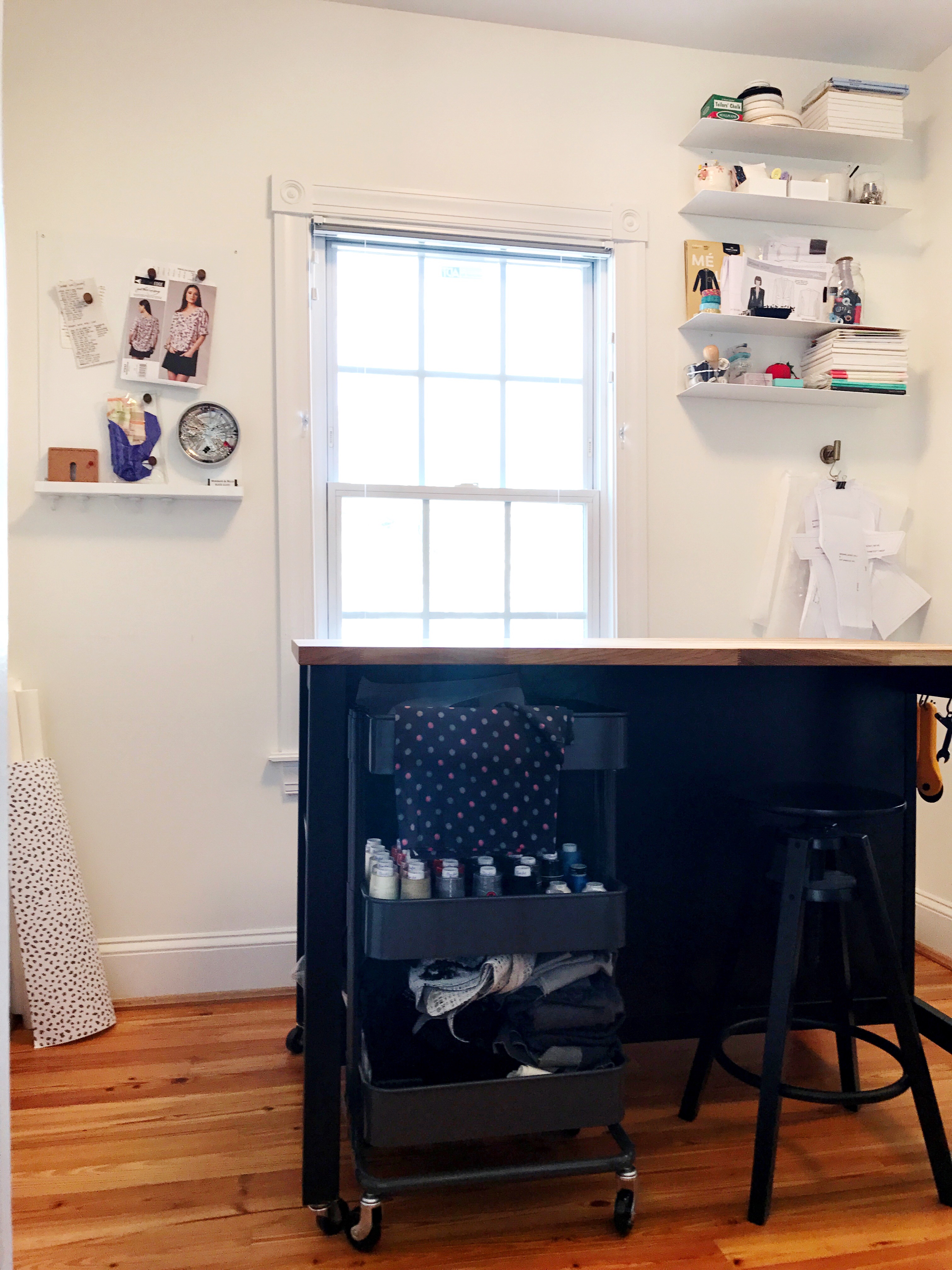 By getting all of my threads, needles, bias tapes and other small notions onto shelves, I freed up a lot of room on the Ikea Raksog cart that lives under the adapted Ikea kitchen island that is my cutting table.