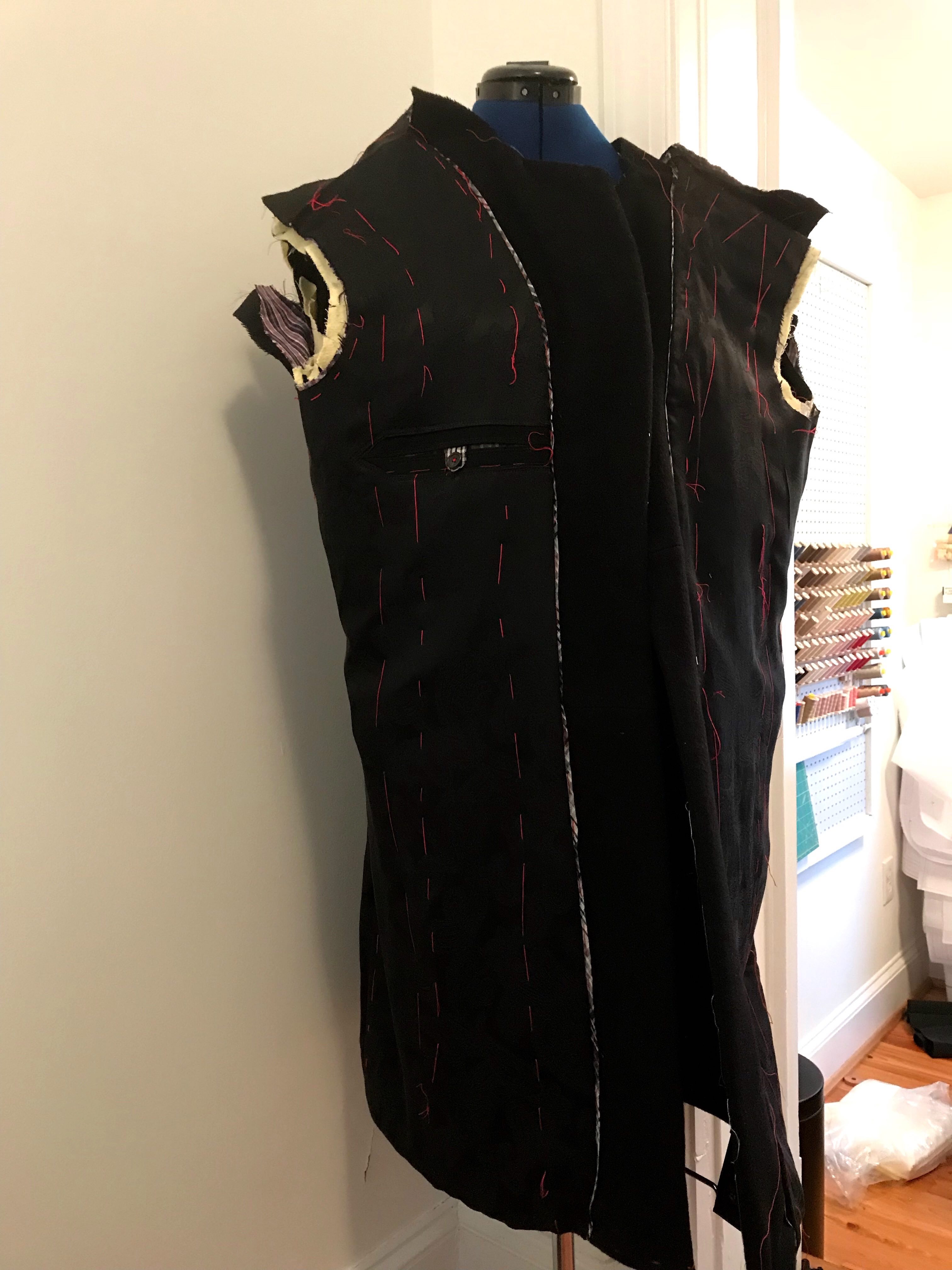 The thing is, it’s actually pretty damn close to being finished: the entire shell is constructed, and it’s completely hemmed and lined. The length and fit through the chest and waist are pretty decent. All that remains is to attach the collar, attach the sleeves and line them, do the buttons, and cover up the remaining of exposed seam allowances with the mostly-installed lining.